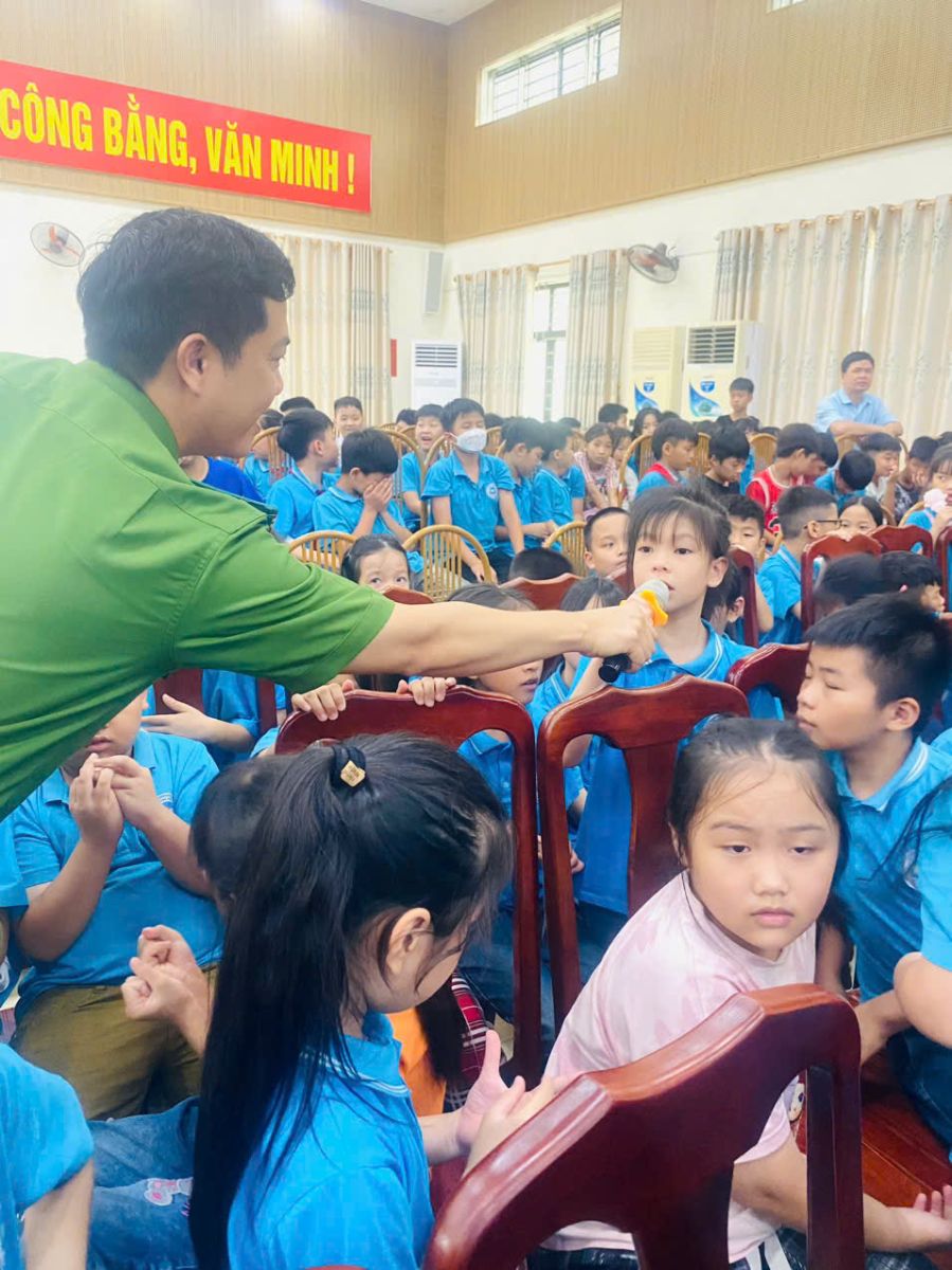 Đồng chí Thượng uý Lê Văn Điệp – Cán bộ công an xã tuyên truyền phòng tránh tai nạn đuối nước cho các em học sinh.