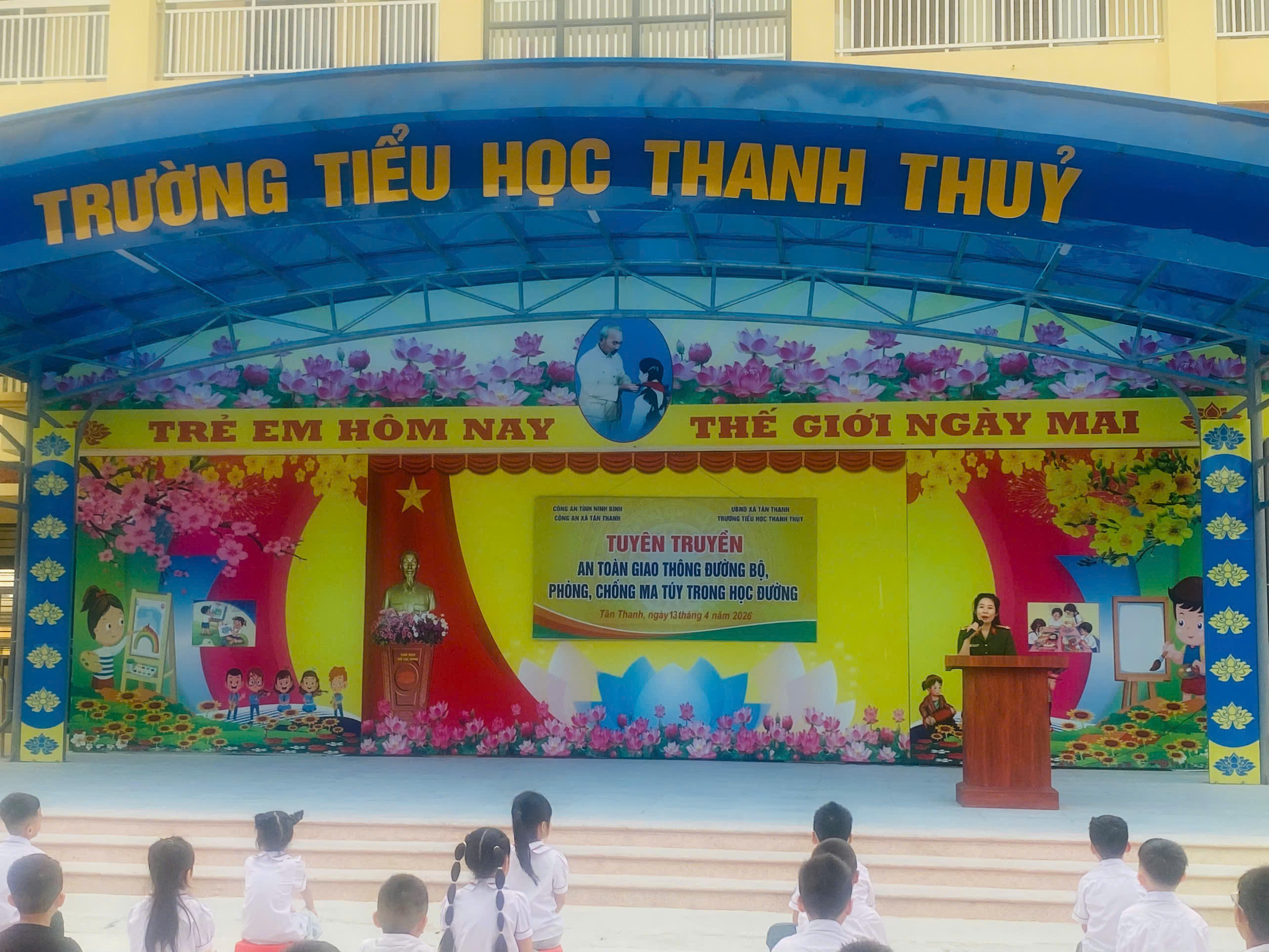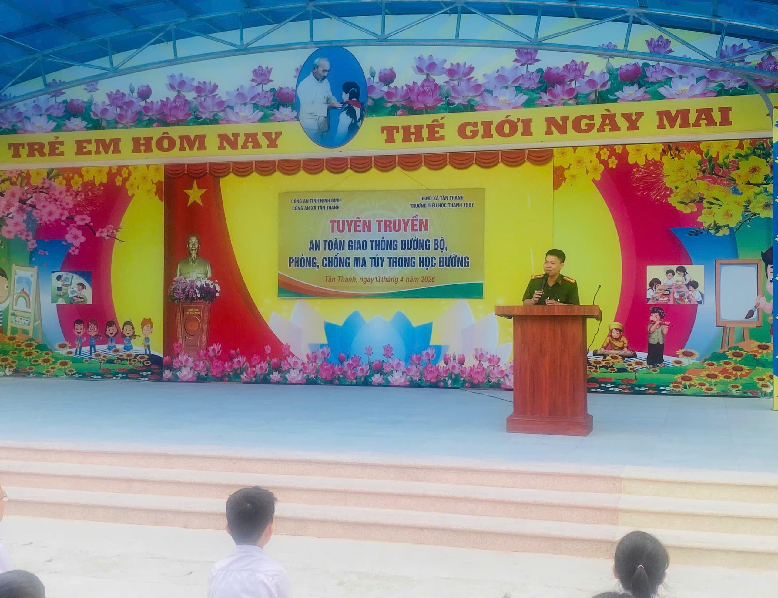 Sáng ngày 13/04/2026, tại sân trường Tiểu học Thanh Thủy, Công an xã Tân Thanh, tỉnh Ninh Bình phối hợp cùng trường Tiểu học Thanh Thủy đã tổ chức buổi tuyên truyền Chuyên đề: “An toàn giao thông đường bộ và Phòng, chống ma túy trong học đường” cho toàn thể cán bộ, giáo viên và học sinh nhà trường.